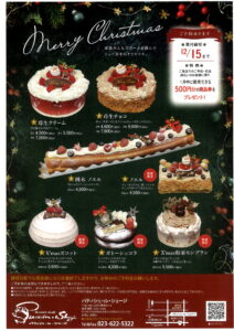 今年は定番の苺生クリーム、純木ノエルなどを含め全7種類のクリスマスケーキ販売致します。